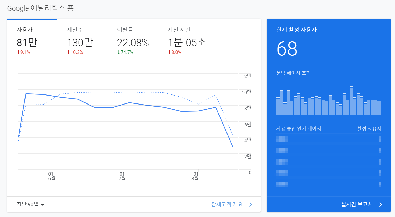 애널리틱스에서 가장 많이 사용하는 메뉴는 홈 메뉴입니다. 해당 메뉴에서 애널리틱스에서 제공하는 11가지의 핵심 데이터를 확인해볼 수 있습니다.