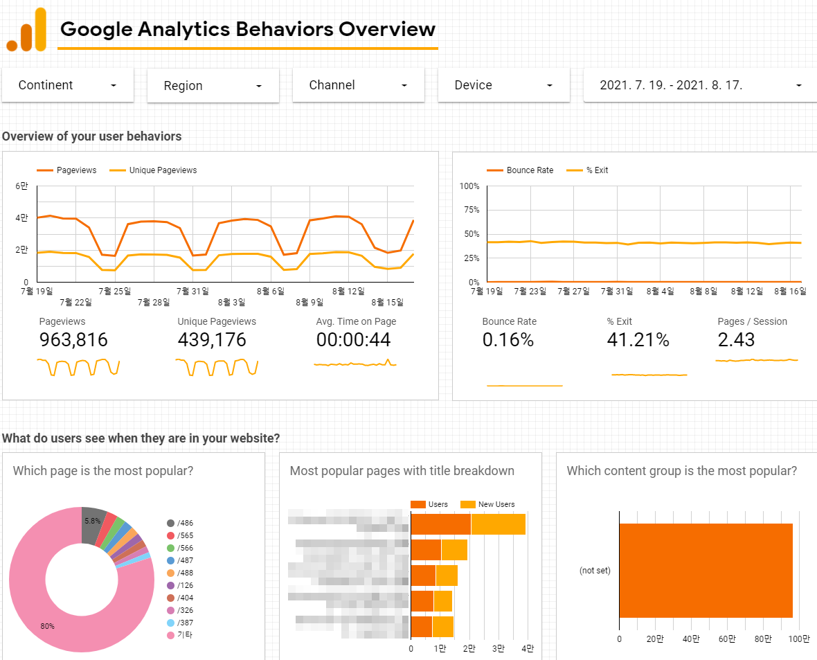 - 행동 : 웹사이트 방문자들이 어떤 행동(조회하는 페이지, 검색하는 키워드 을 하는지 보여줍니다.