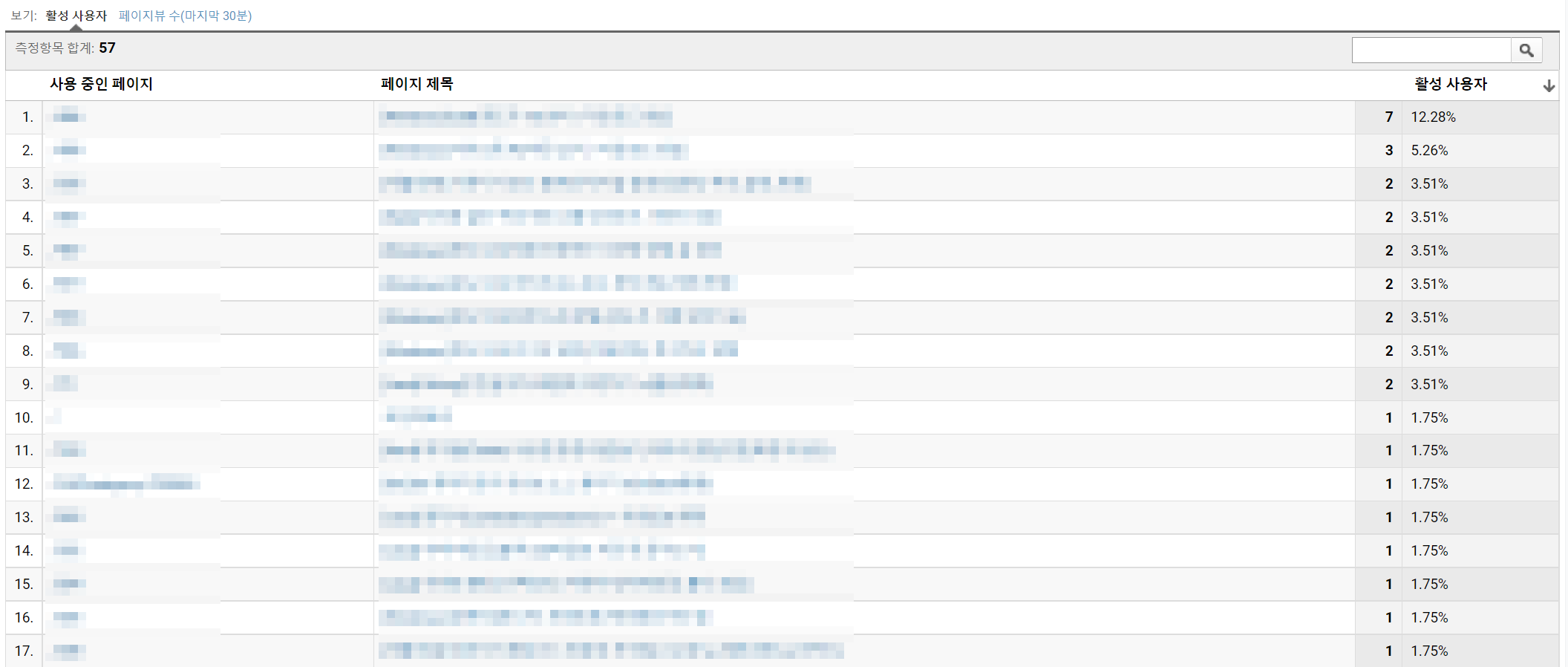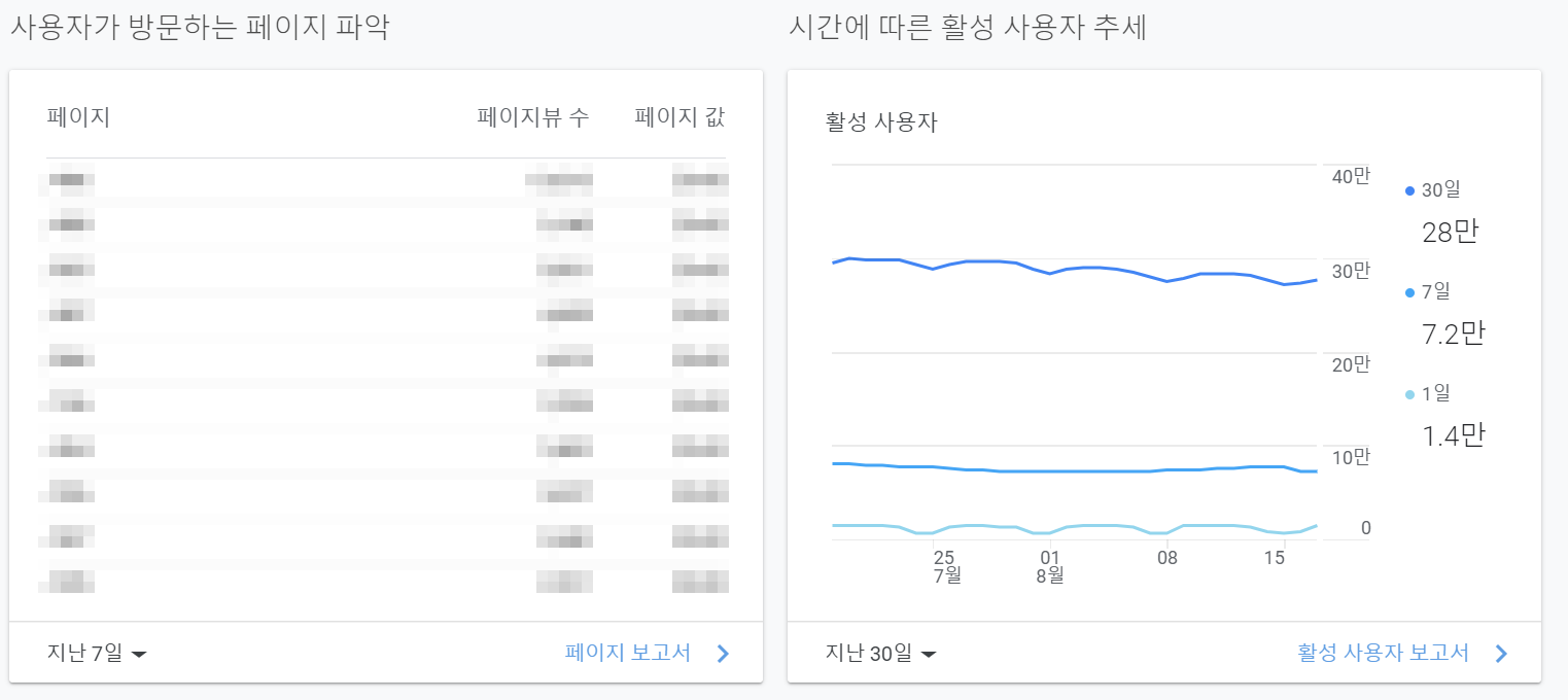 - 콘텐츠 (Content): 활성 사용자들이 어떤 페이지를 보고 있는지 혹은 최근 30분 동안 사용자들이 어떤 페이지를 보았는지 확인할 수 있습니다.