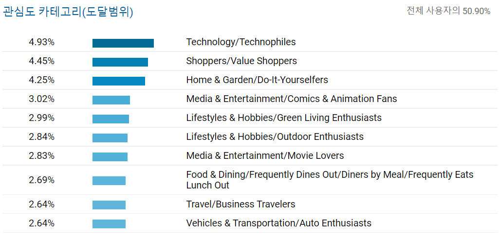 - 관심 분야 (Interests): 관심 분야 보고서는 사용자들이 어떤 콘텐츠를 선호하는지 보여줍니다. 잠재고객들이 선호하는 분야를 파악하면 추후에 콘텐츠 제작과 광고 등을 더욱더 효율적으로 할 수 있습니다.