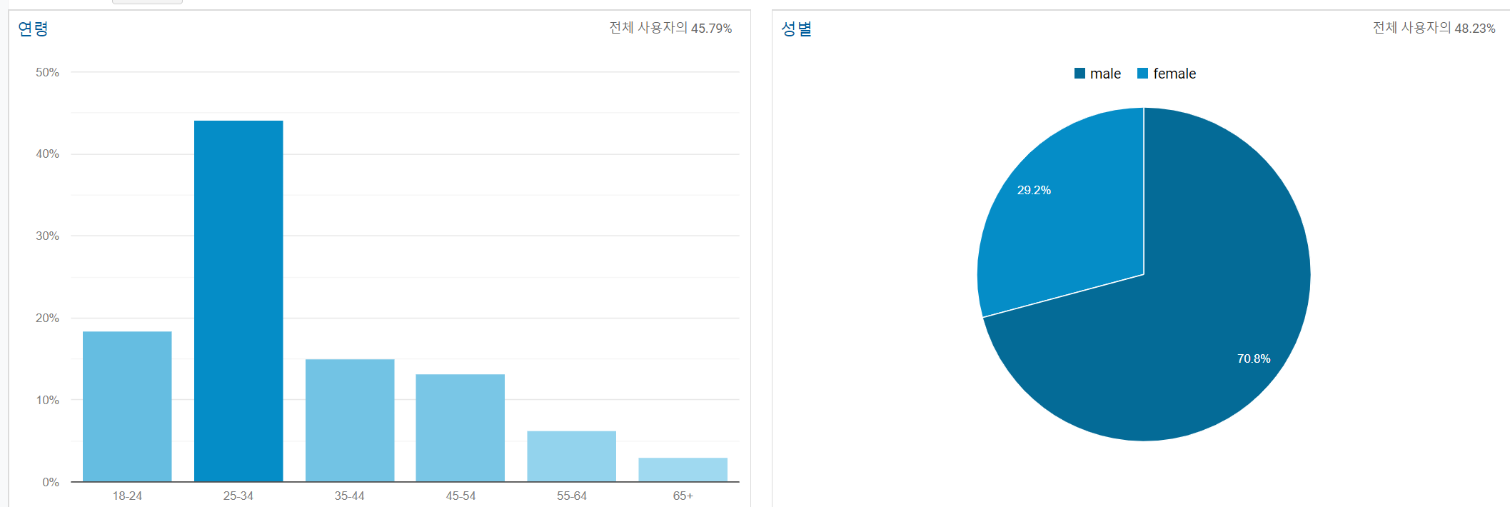 - 인구 통계 (Demographics): 인구 통계 보고서는 사용자의 연령 및 성별 정보를 보여줍니다. 사용자의 연령 및 성별 구성을 알게 되면 웹사이트 디자인부터 콘텐츠, 광고까지 잠재고객에 맞춤화할 수 있습니다.