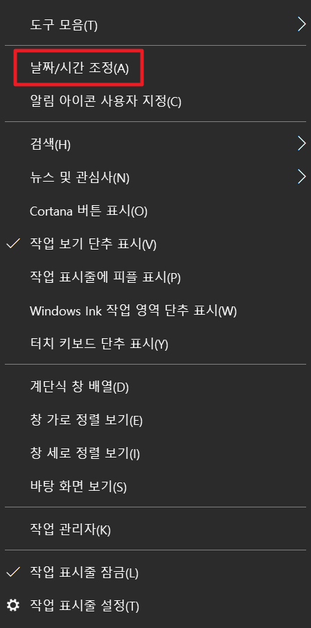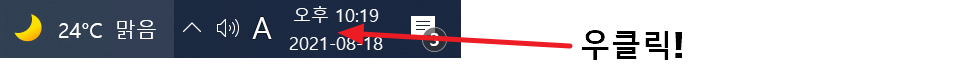 1. 작업표시줄의 날짜/시간에서 우클릭을 합니다.