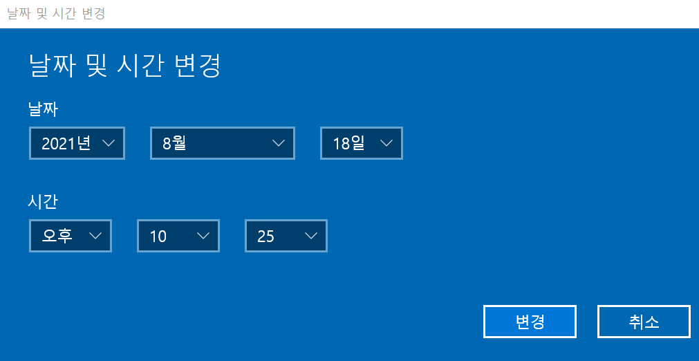 2. 그러면 위와 같이 날짜 및 시간 변경을 할 수 있는 창이 뜨는데 이곳에서 수동으로 설정해준 뒤 변경 버튼을 눌러주시면 됩니다.