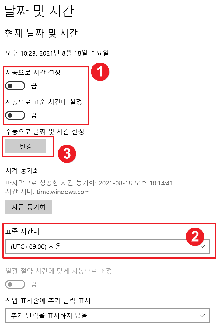 1. 인터넷이 되지 않는 환경이라면 수동으로 세팅하셔야 합니다. 위와 같이 자동으로 시간 설정과 자동으로 표준 시간대 설정을 끔으로 바꿔주고 표준 시간대를 선택해준 뒤 변경을 누릅니다.