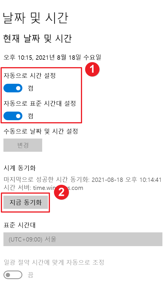 3. 자동으로 표준 시간대 켬으로 설정을 하게 되면 표준 시간대가 서울로 잡힐 것입니다. 이상태에서 자동으로 시간 설정을 켬으로 체크하고 지금 동기화를 눌러주면 시간대가 재 동기화됩니다.