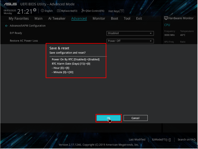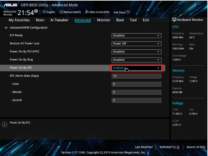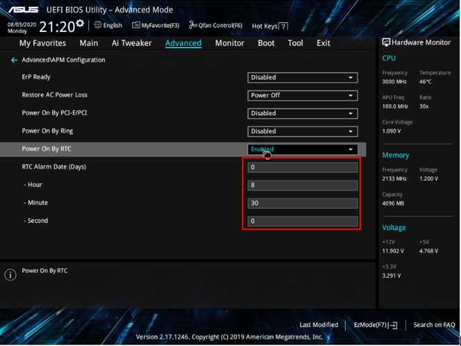 5. Power on By RTC에서 자동으로 부팅될 시간을 세팅합니다. 매일매일 정해진 시간에 부팅하고자 한다면 RTC Alarm Date (Days)에 위와 같이 0을 넣어주고 부팅될 Hour, Minte, Second를 정해줍니다.