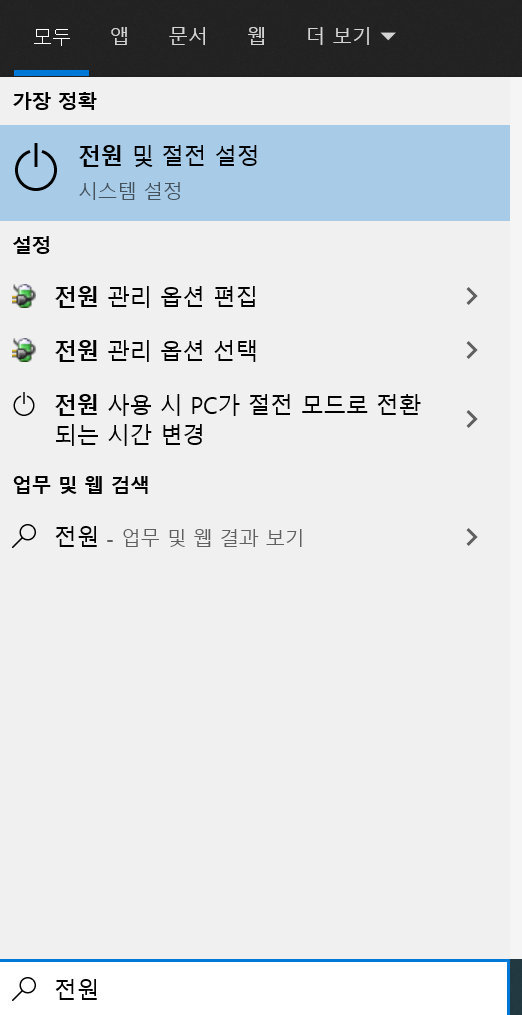 1. 윈도우의 작업표시줄에 전원이라고 입력한 후 전원 및 절전 설정에 들어갑니다.