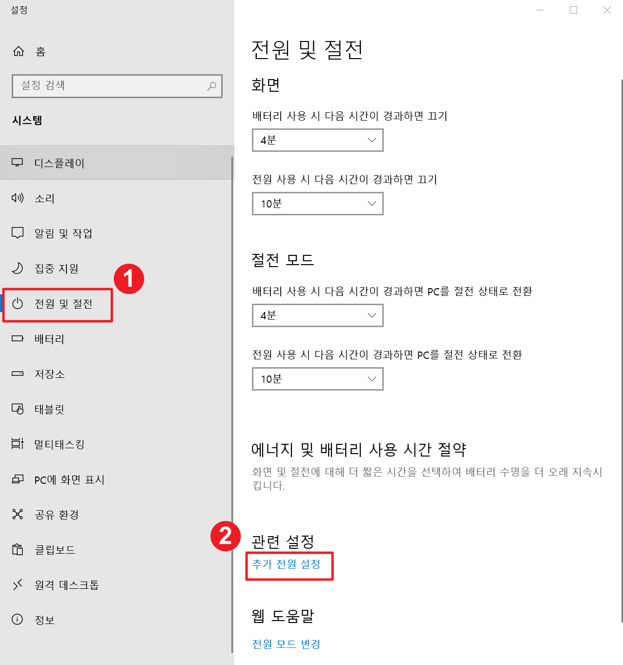 2. 전원 및 절전 탭에서 추가 전원 설정으로 들어갑니다.