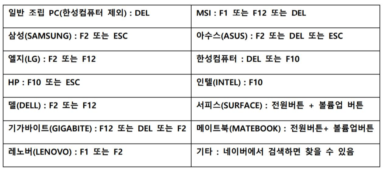 1. 위의 표에서 자신의 컴퓨터 제조사에 맞는 바이오스 단축키를 확인하시고 바이오스에 진입해주세요.