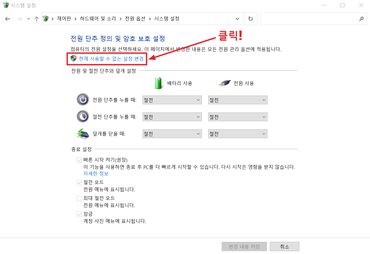 4. 현재 사용할 수 없는 설정 변경을 클릭합니다.