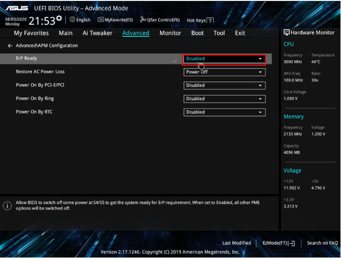 4. Erp ready와 Power on By RTC를 Disabled로 설정합니다.