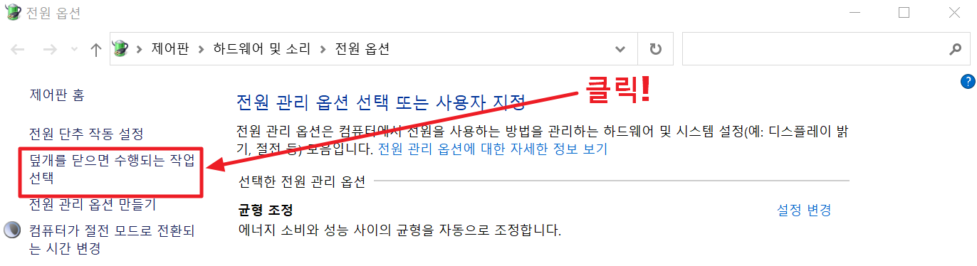 3. 전원 옵션에서 "덮개를 닫으면 수행되는 작업 선택"을 클릭합니다.