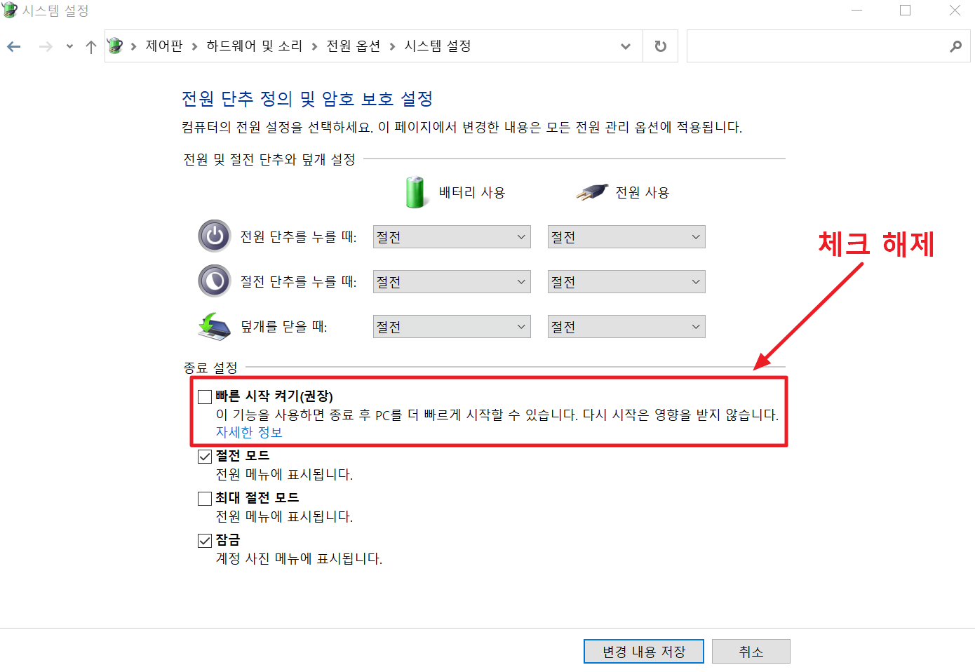 5. 빠른 시작 켜기(권장)을 체크 해제하고 변경 내용 저장을 하면 자동 부팅 설정이 적용될 것입니다.
