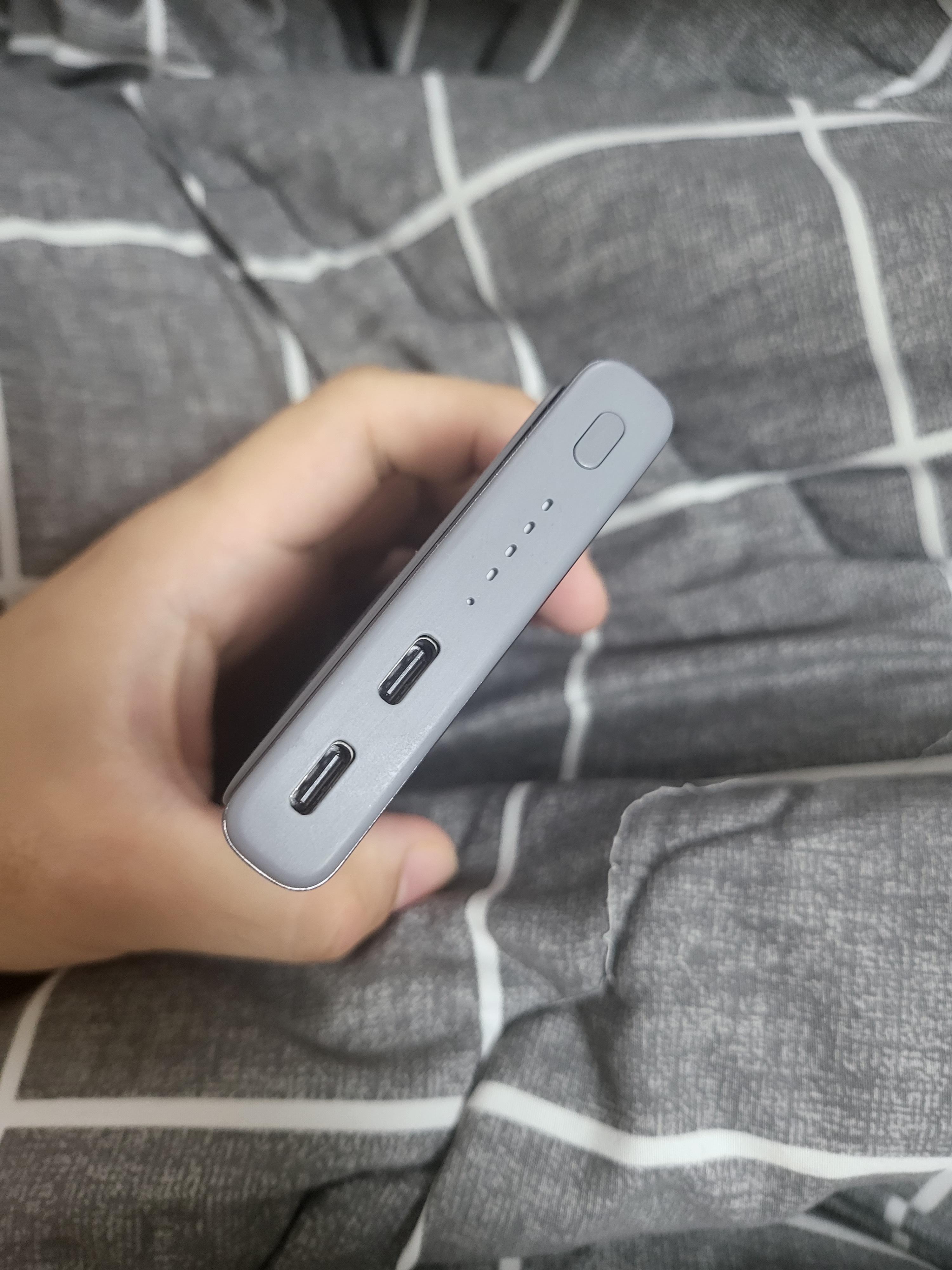 특별한 특징 없는 일반적인 보조 배터리입니다. 구성품으로는 보조 배터리 본체 1, TypeC to TypeC 케이블 1, 간단 설명서 이렇게 구성되어 있습니다. TypeC 충전 단자는 두 개인데 동봉되어있는 케이블은 1개라 그 부분이 조금 아쉽습니다. 실제 들어보니 무게는 생각보다 묵직합니다. 제가 가지고 있는 갤럭시 폴드 3와 비등비등할 정도네요.