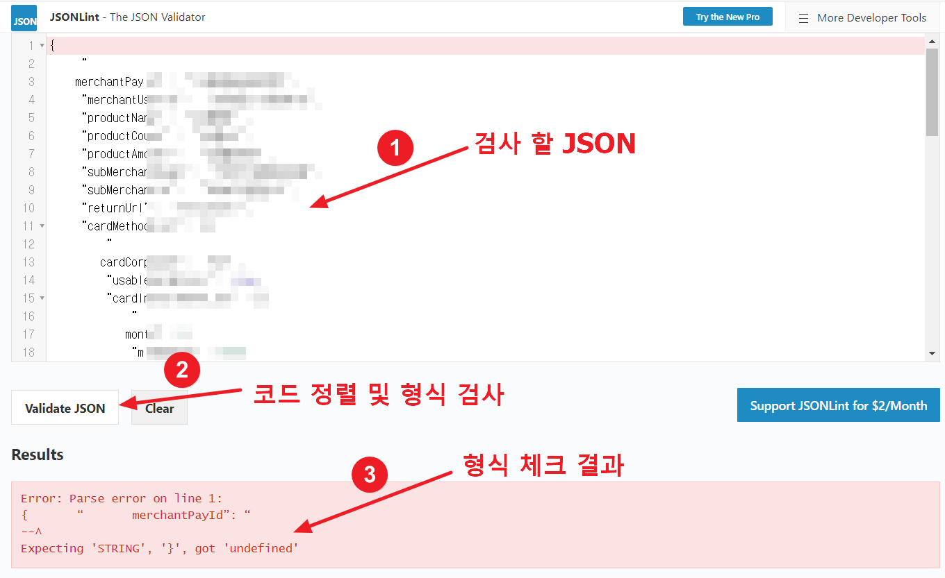 사용법은 위 사이트에 들어간 후 코드를 붙여넣고 Validate JSON 버튼을 누르시면 됩니다. 버튼을 누르시면 코드가 즉시 정렬되고 잘못된 부분이 있다면 위와 같이 오류 메시지를 확인하실 수 있습니다.