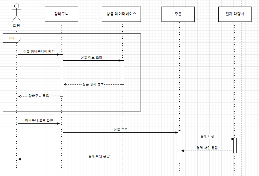 쇼핑몰 사이트에서 고객이 상품을 장바구니에 담고 결제를 하는 프로세스를 시퀀스 다이어그램으로 작성해보았습니다.