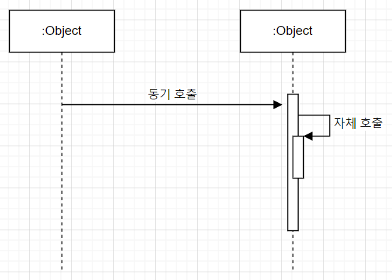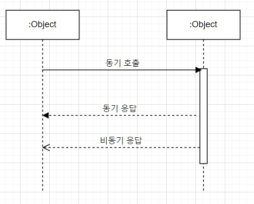 동기 호출은 요청을 보낸 뒤 응답이 올때까지 기다립니다. 동기 호출 메시지는 꽉찬 화살표에 실선으로 표기하며 동기 응답은 꽉찬 화살표에 점선, 비동기 응답은 빈 화살표에 점선으로 표시합니다.
