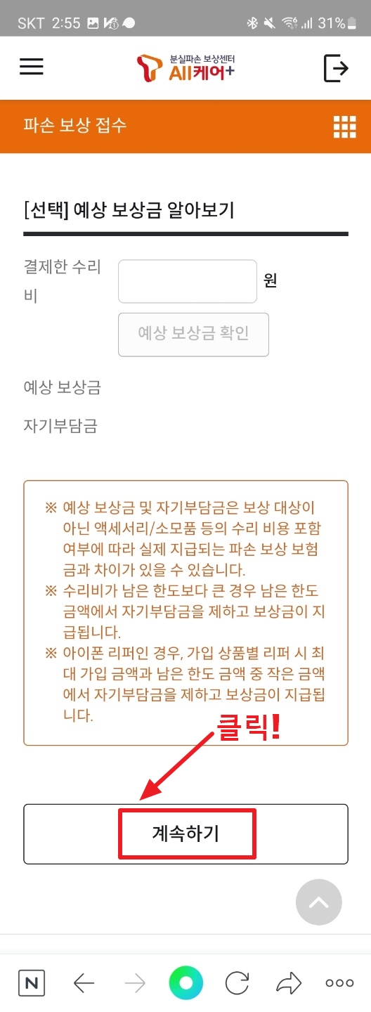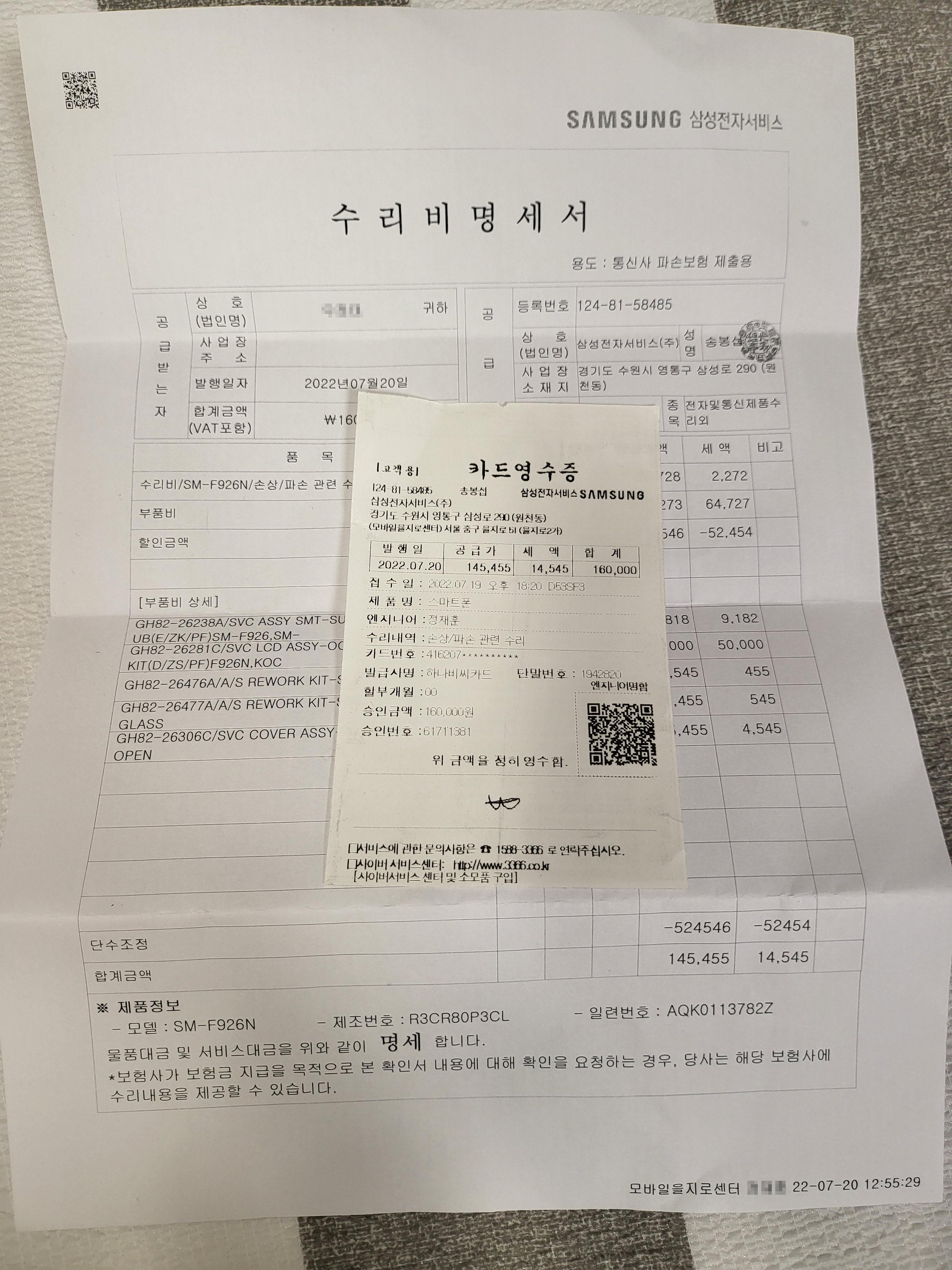 5. 수리 내역서와, 수리비 영수증은 삼성 서비스센터에서 받은 명세서와 카드 영수증을 그대로 사진으로 찍어서 첨부해주시면 됩니다.