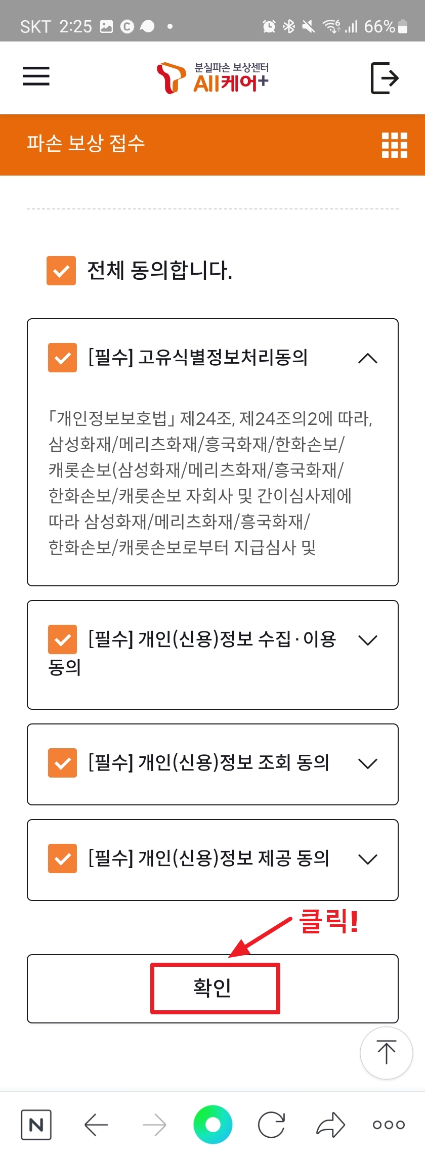 4. "전체 동의합니다"를 클릭한 후 확인 버튼을 누르고 파손 보험금 신청서의 내역을 채워주시면 됩니다.