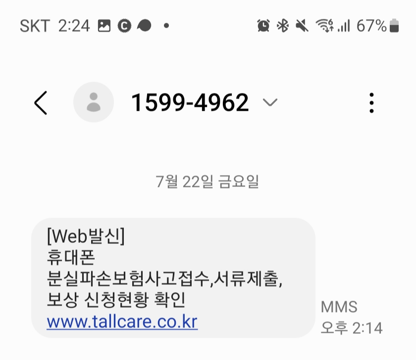 1. 1599-4962로 전화를 건 후 모바일 접수 1번을 누른 뒤 핸드폰 번호를 입력하면 위와 같이 문자메시지로 URL이 옵니다. 이 URL을 클릭해 주세요.