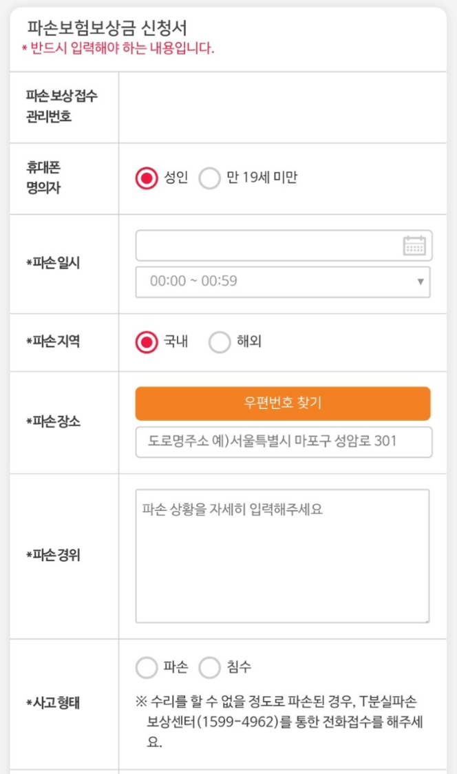 | SKT | 1. 1599-4962 전화 2. 모바일 접수 1번 3. 휴대폰 번호 입력 4. T World 어플 실행 5. 본인인증 6. 사고 경위 작성 후 영수증, 견적서 사진 첨부 |