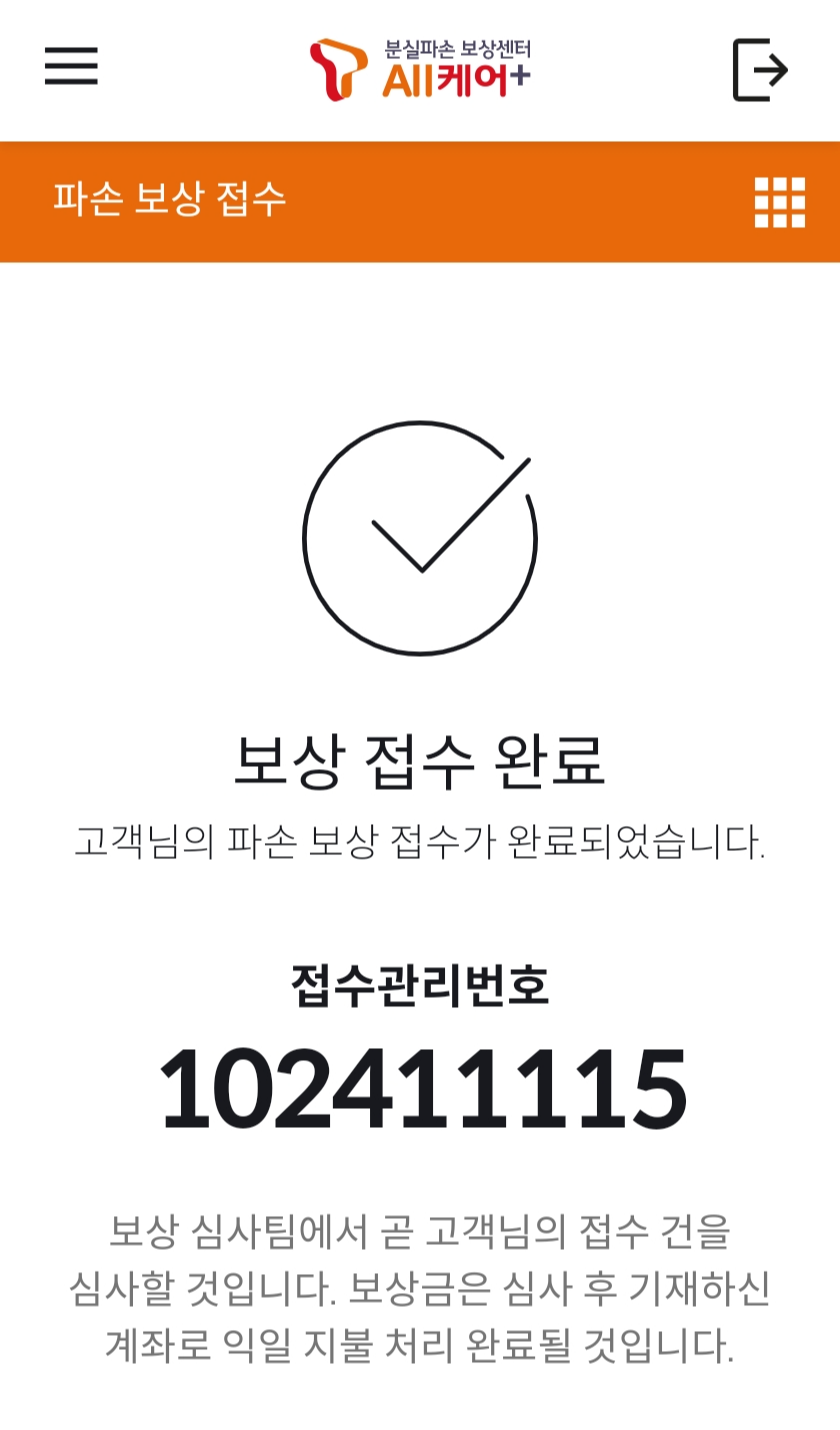 6. 보상 신청이 끝나면 위와 같이 접수관리번호가 뜹니다. 이제 약 이틀 ~ 삼일 정도만 기다려주시면 됩니다.