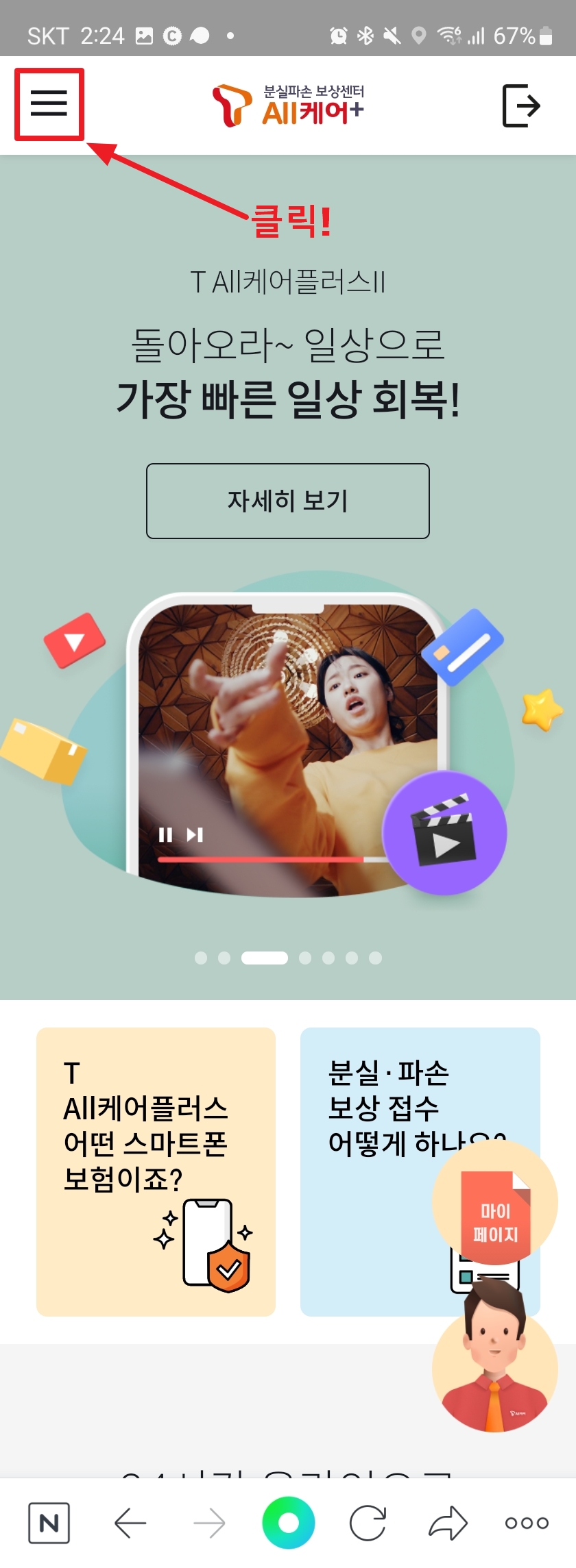 | KT | 1. 플레이스토어 -> 폰케어(KT) 다운로드 2. 어플실행 후 본인인증 3. 파손사유 작성 후 영수증, 견적서 사진 첨부 |