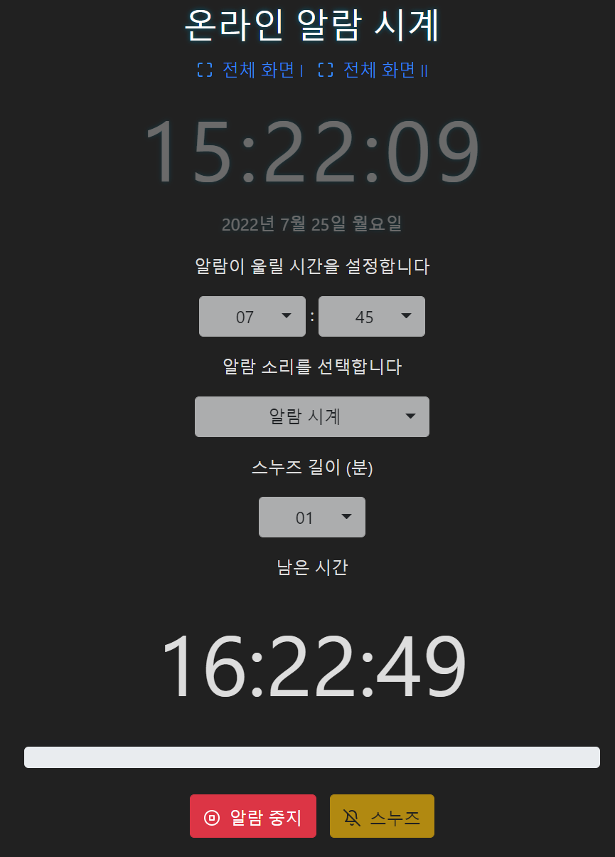 알람 설정 버튼을 누르면 위와 같이 남은 시간이 표시되며 알람이 설정됩니다.
