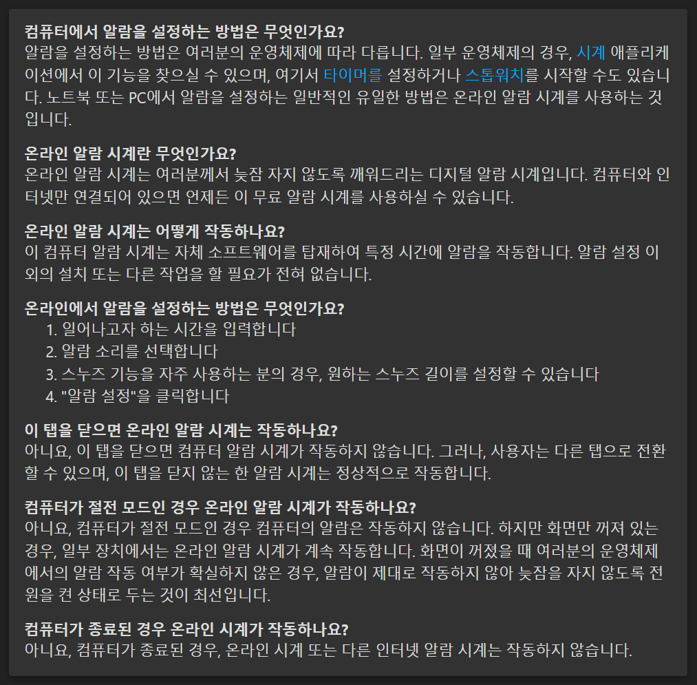 일반인들은 주로 핸드폰으로 아침 알람을 듣지만 핸드폰이 고장 났거나 분실하는 등의 피치 못할 사정으로 핸드폰 알람을 듣지 못하는 경우가 생길 수 있습니다. 이럴 때 알람 시계를 사는 것보다 기존에 사용하는 PC를 활용하여 알람을 세팅할 수도 있습니다. 온라인 알람 사이트에서 간단한 설정만으로 알람을 들으실 수 있어 알람 프로그램을 설치할 필요성이 없어 매우 편리합니다.