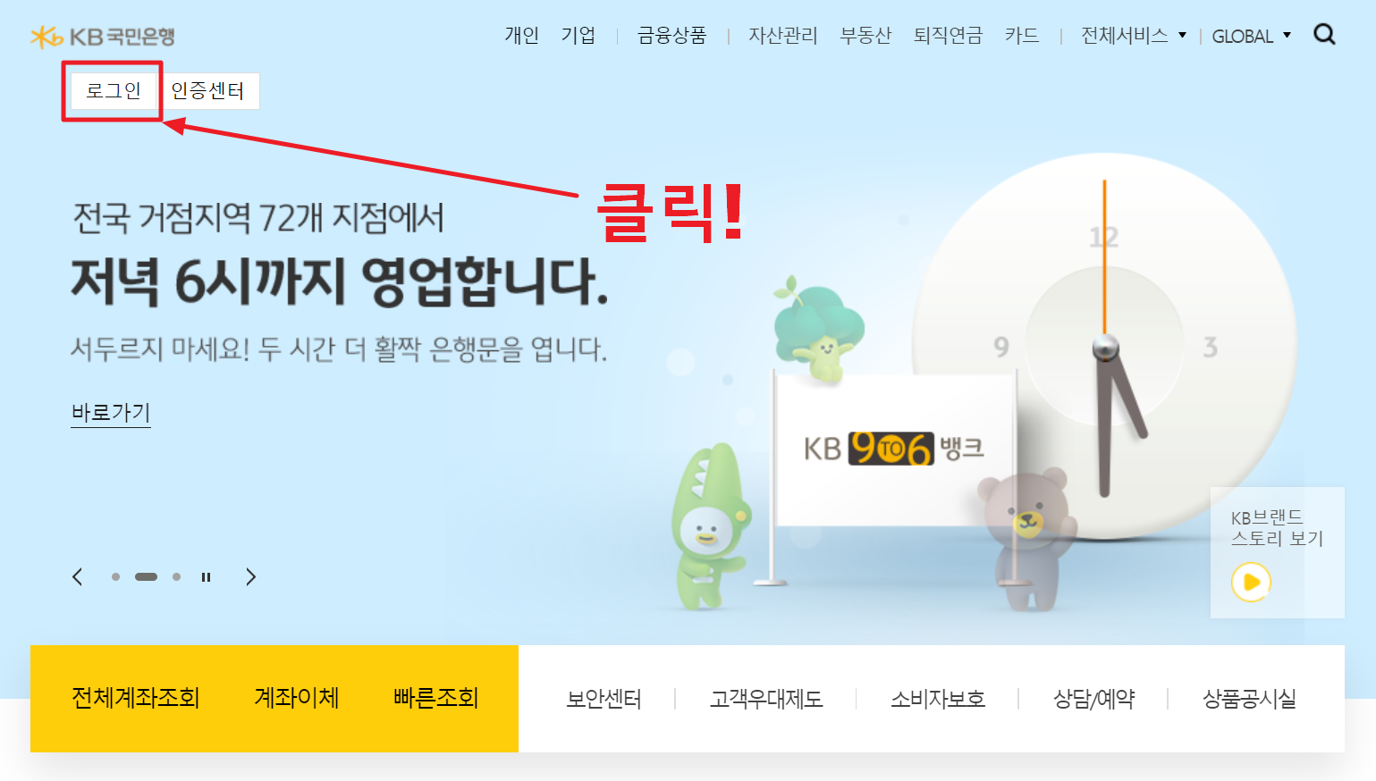1. 아래 링크되어 있는 국민은행 홈페이지에 접속하여 로그인을 합니다.