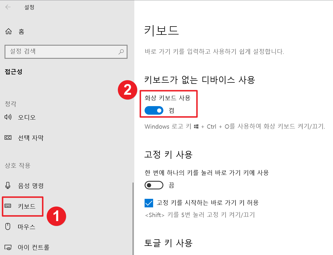 3. 접근성 설정에서 좌측의 리스트를 내리시다보면 상호 작용의 키보드가 있으실 겁니다. 그걸 누른 뒤 키보드가 없는 디바이스 사용에서 화상 키보드 사용을 켬으로 체크해줍니다.