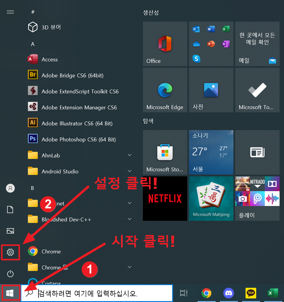 1. [ 작업표시줄 시작 ] -> [ 설정 ] 을 클릭합니다.