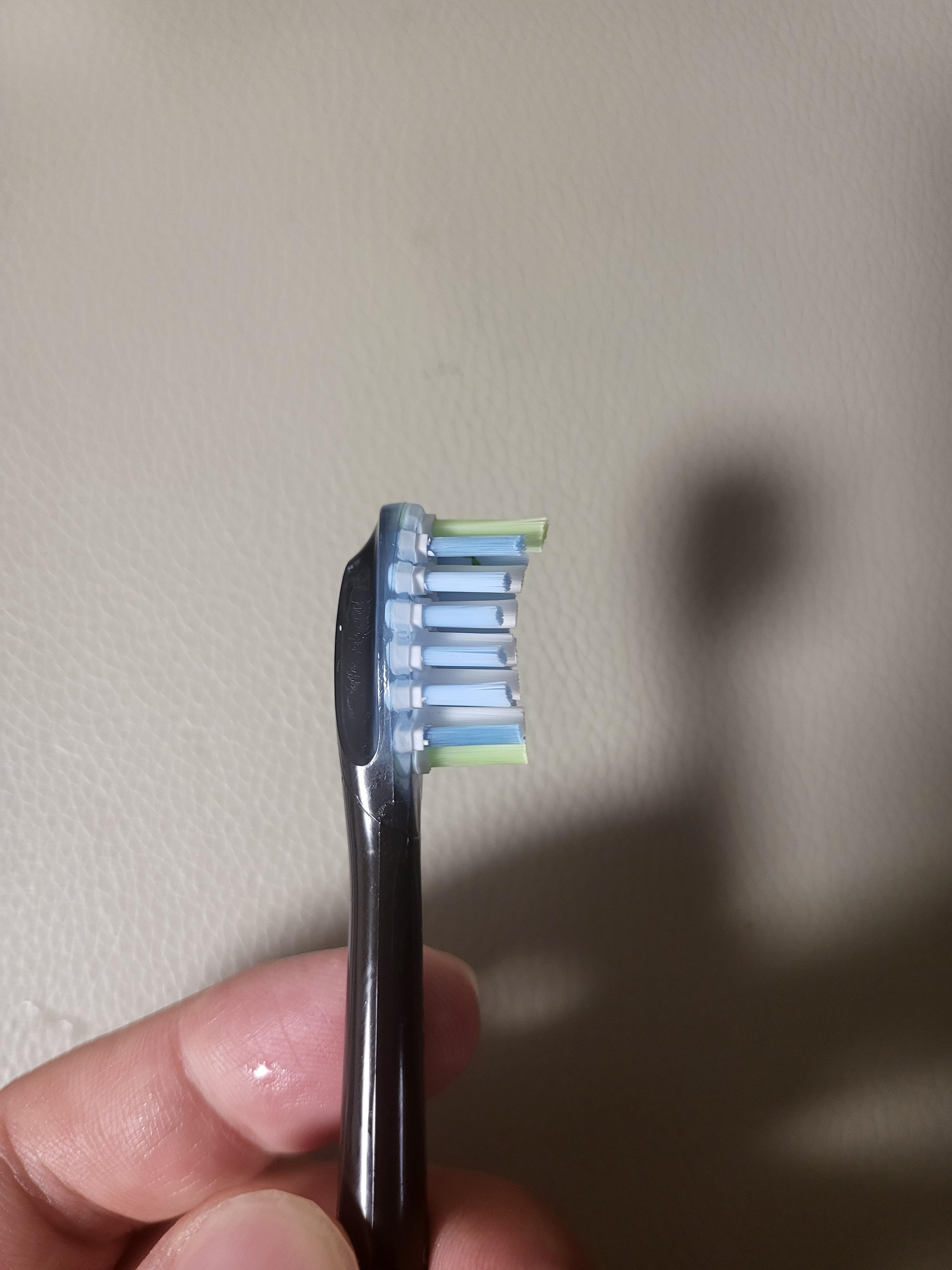 기본 칫솔모는 위와 같이 약간 둥근 모양으로 되어 있어 치아를 잘 덮을 수 있는 구조로 되어 있습니다.