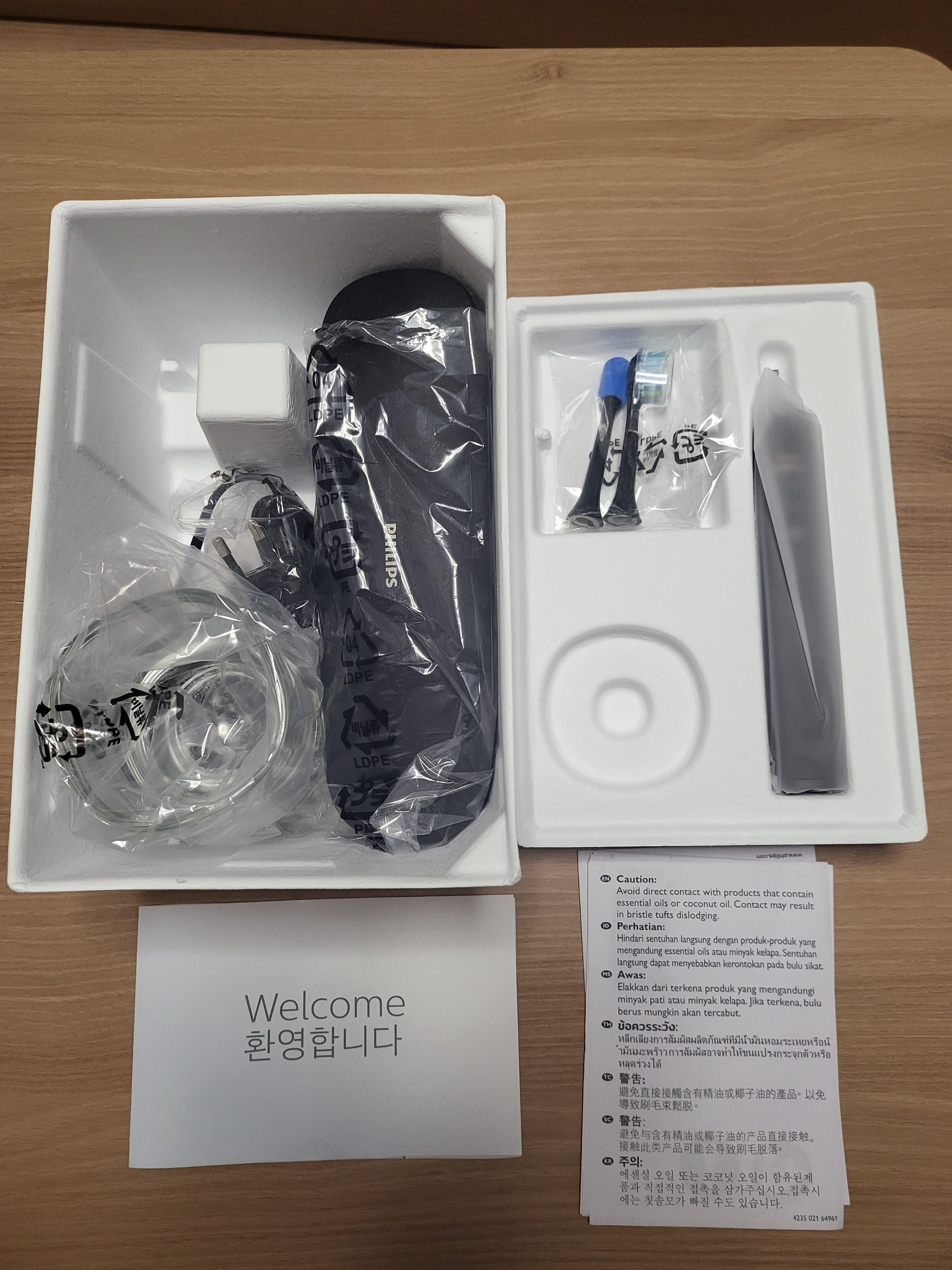 필립스 소닉케어 다이아몬드클린 9000의 구성품은 칫솔 본체, 충전 콘센트와 양치컵(충전 컵), 여행용 수납함, 그리고 기본 칫솔모 1개, 혀클리너 1개 이렇게 담겨 있습니다.