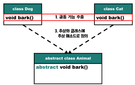 public abstract void bark(); //짖는 소리는 동물마다 다르므로 추상메서드로 생성