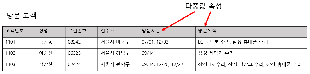 엔티티 타입 내에서 하나의 속성은 한 시점에 한 개의 값만을 가져야 합니다. 하지만 위의 "방문 고객"이라는 테이블의 속성을 보시면 고객의 방문 횟수에 따라 방문시간, 방문 목적의 속성의 값에 여러 가지 값이 들어가고 있습니다. 이렇게 여러 개의 값이 들어가는 속성을 다중값 속성이라고 하며 이럴 경우에는 새로운 엔티티를 생성해서 다중 값을 없애야 합니다.