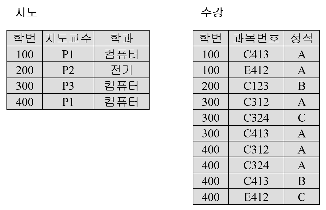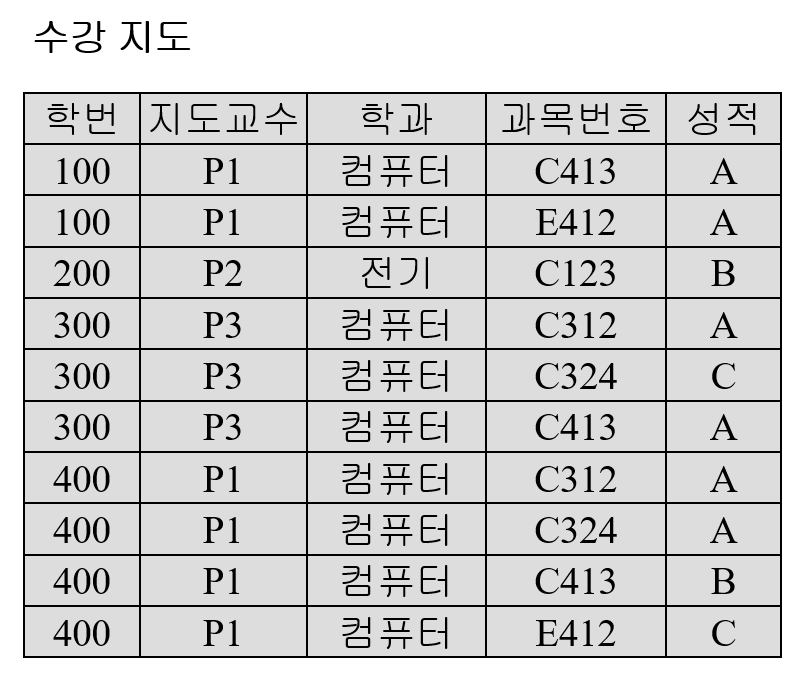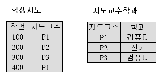 지도교수 P1의 소속이 컴퓨터공학과에서 전자과로 변경된다면 학번이 100과 400번인 두 개의 튜플 모두를 변경해야 함
