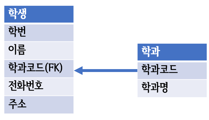 이러한 현상을 해결하기 위해서는 정규화를 수행하여 위와 같이 학생과, 학과 테이블을 나뉘어 관리해주어야 합니다. 이렇게 테이블이 분해되면 학생과 학과 테이블간에 불필요한 데이터를 입력해도 되지 않으므로 중복 데이터가 제거되며 필요한 경우 학과코드로 조인(Join)을 수행하여 하나의 합집합으로 만들어 사용할 수도 있습니다.