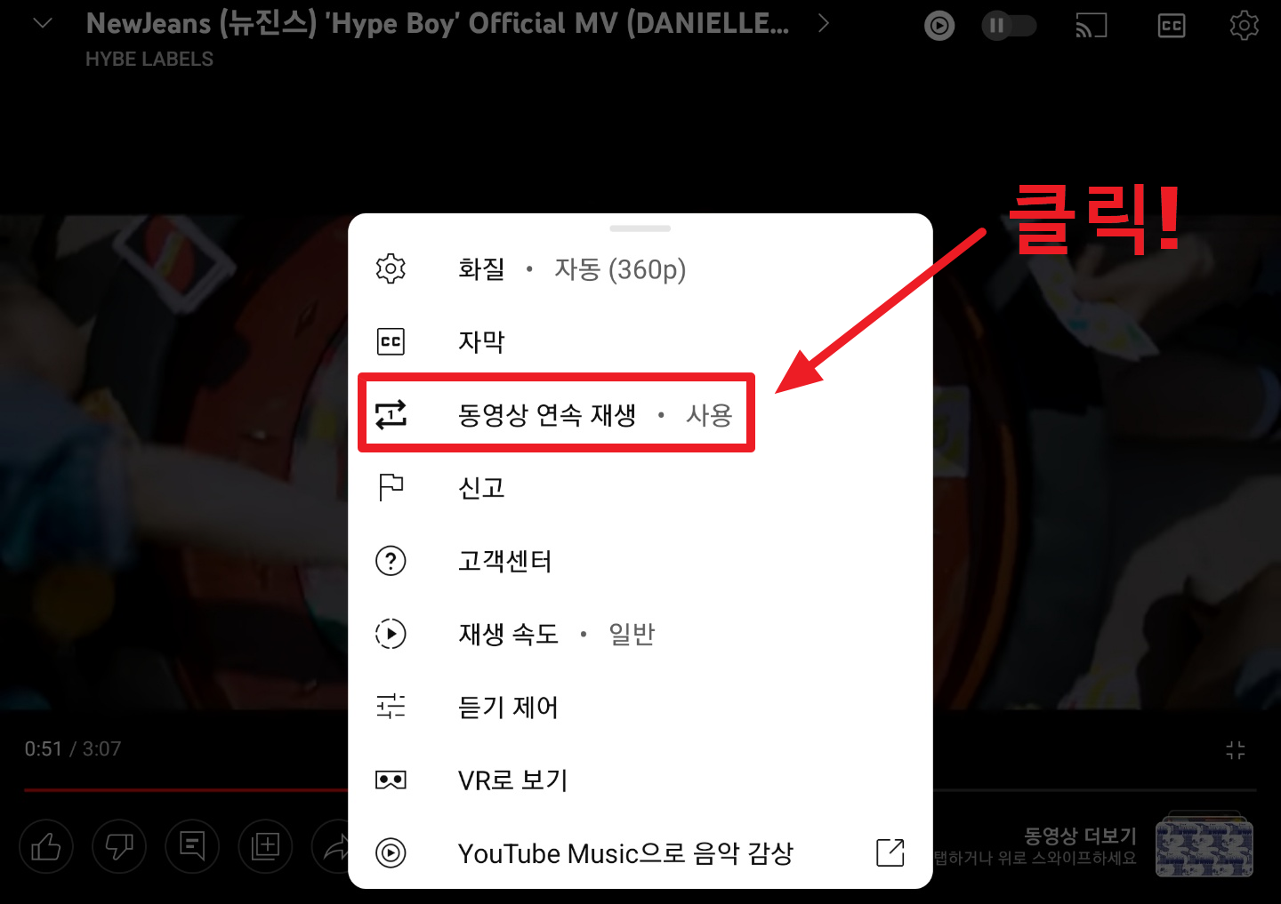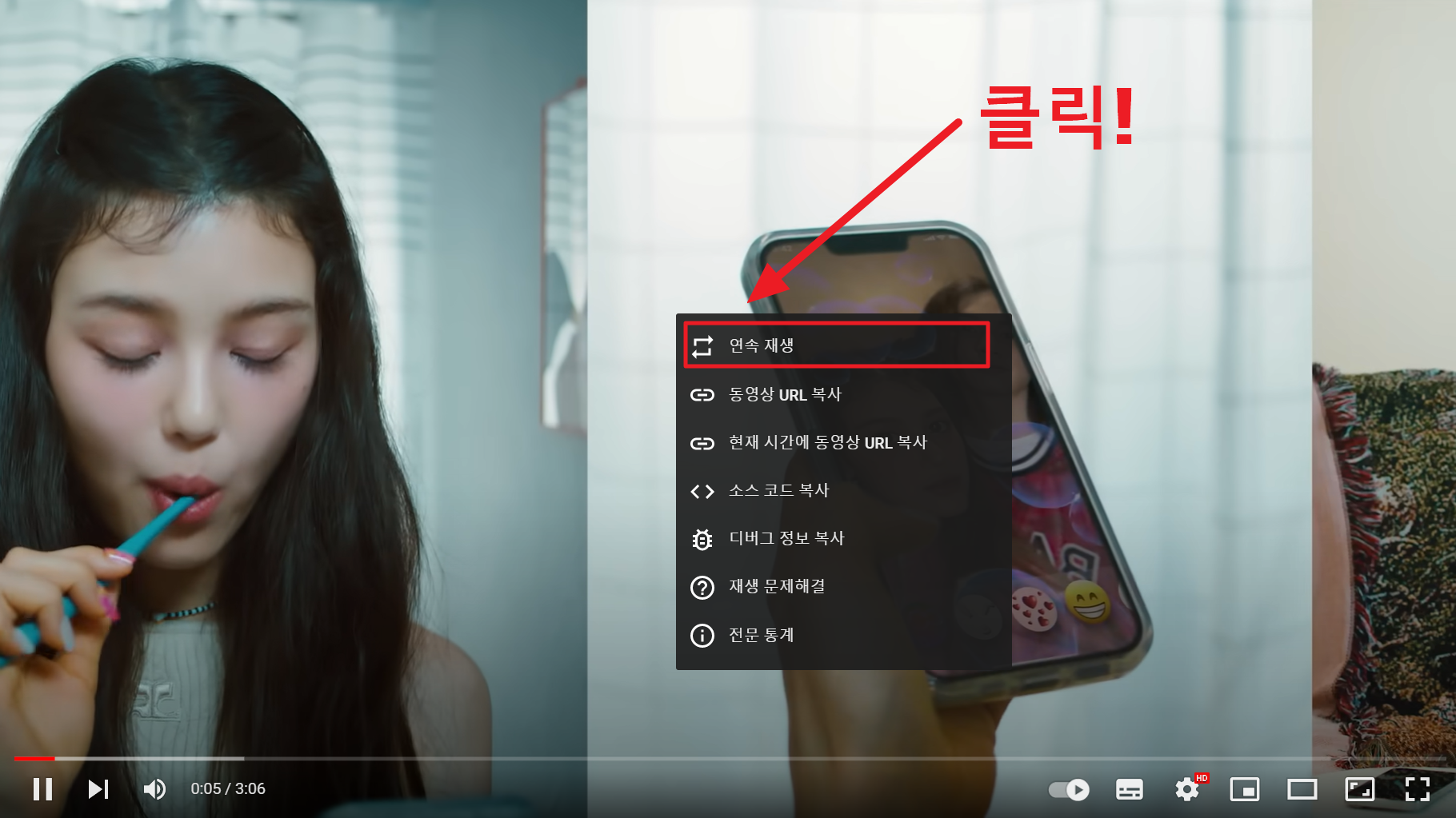 PC에서도 반복재생하고 싶은 유튜브 영상을 켠 뒤 마우스 우측버튼을 눌러보시면 위와 같이 연속 재생이라는 버튼이 있습니다. 이 버튼을 눌러주시면 같은 영상을 무한대로 반복 재생할 수 있습니다.