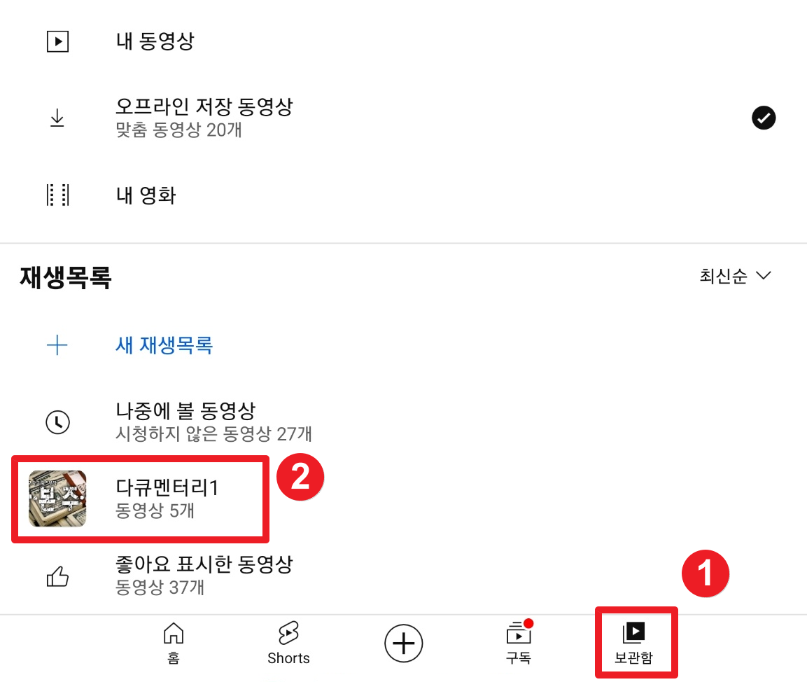 5. 유튜브 앱 하단에 있는 보관함 버튼을 클릭한 뒤 재생목록 리스트에서 아까 생성한 재생목록을 클릭합니다.