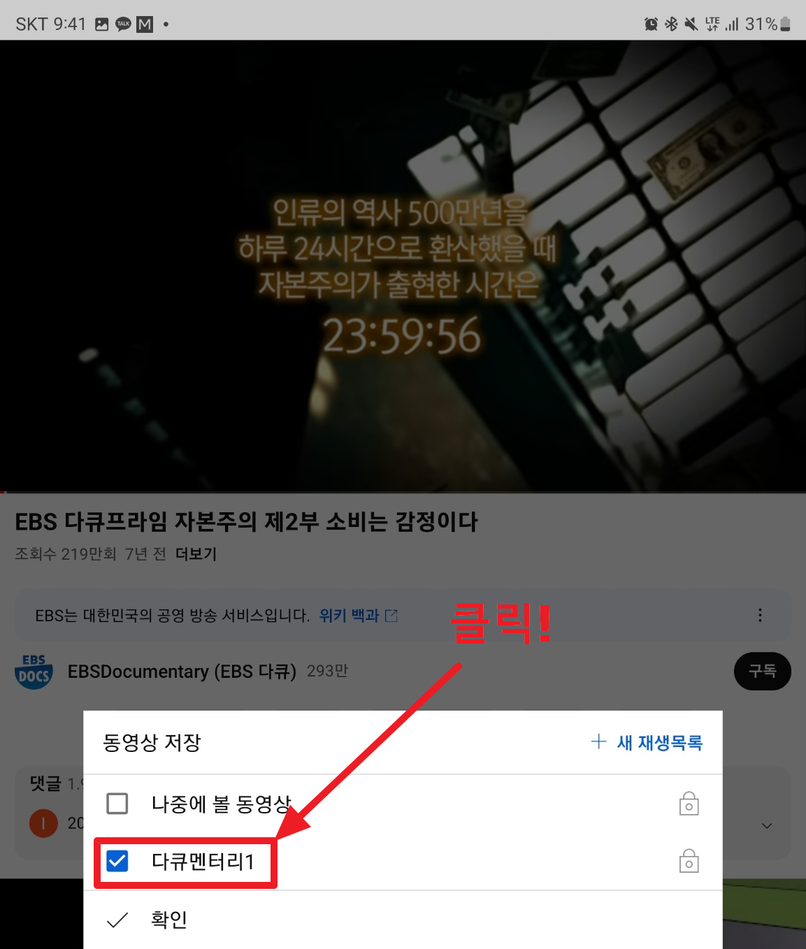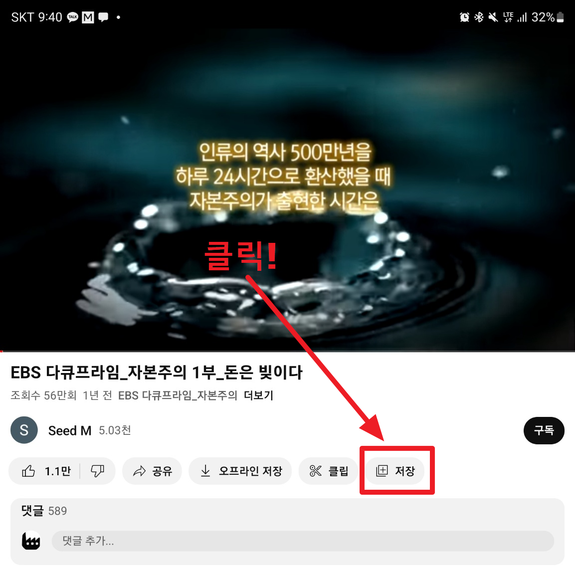 1. 플레이리스트로 만들고 싶은 영상을 찾으신 뒤 영상 우측 아래에 있는 저장 버튼을 클릭합니다.