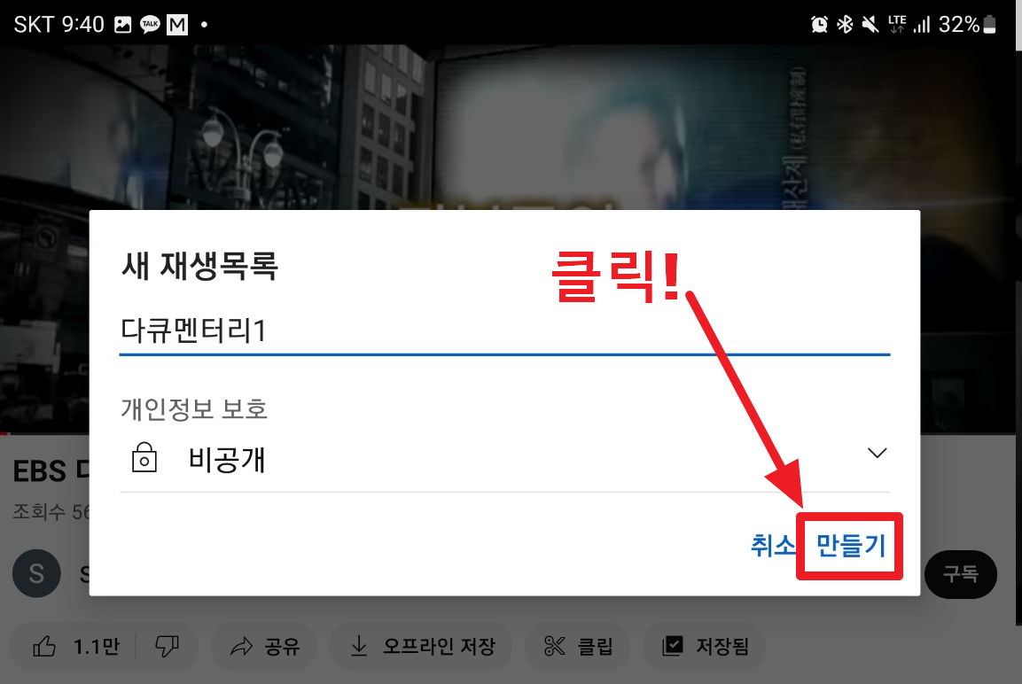 3. 새로운 재생목록의 이름을 짓고 만들기 버튼을 눌러 나만의 재생목록을 만들어 줍니다.