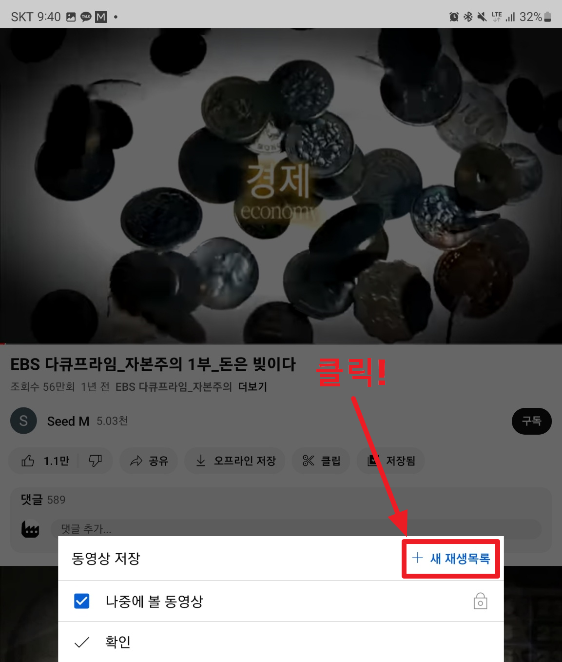 2. 저장버튼이 저장됨으로 바뀌면서 아래쪽에서 동영상 저장 팝업창이 올라오게 될텐데요. 여기서 새 재생목록을 클릭합니다.
