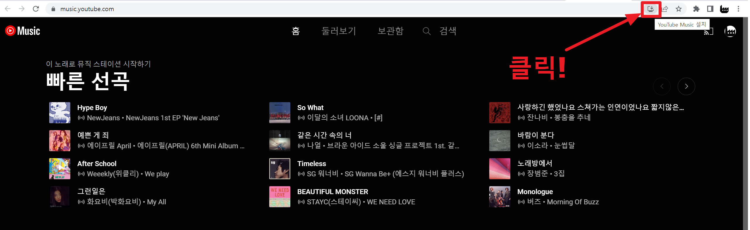 2. 유튜브 뮤직 사이트의 주소창 우측에 보시면 YouTube Music 설치 아이콘이 있습니다. 이것을 클릭합니다.