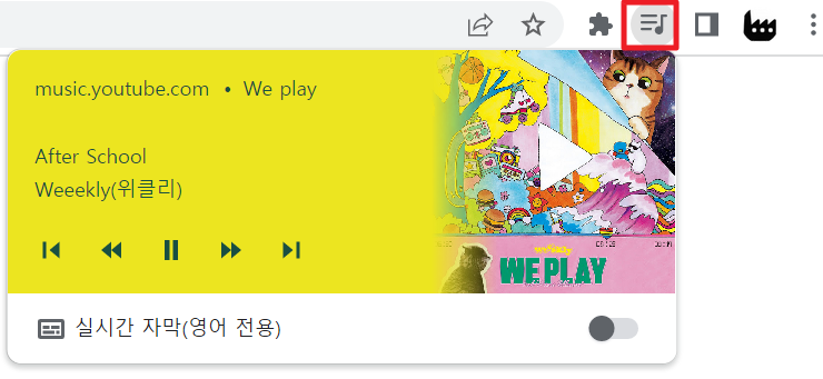 6. 엄연히 따지자면 유튜브 뮤직은 크롬 확장 프로그램으로 설치되는 것이기에 크롬 우측 상단에 음악 아이콘을 클릭하셔서 현재 재생되고 있는 음악과, 유튜브 뮤직으로 바로 들어갈 수 있는 등의 조작도 할 수 있습니다. 창 크기도 조절하실 수 있어요!