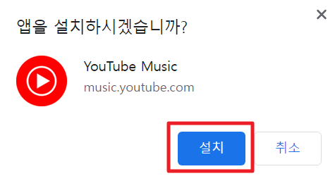 3. "앱을 설치하시겠습니까?"라는 팝업창이 뜨면 설치 버튼을 클릭하고 유튜브 뮤직 앱을 다운받습니다.