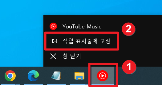 5. 유튜브 뮤직을 실행시키면 브라우저가 실행되는 것이 아닌 작업표시줄의 유튜브 뮤직 아이콘이 생성되면서 실행되는 것을 보실 수 있습니다. 유튜브 뮤직을 자주 사용하시는분이라면 유튜브 뮤직 아이콘을 우클릭한 후 작업 표시줄에 고정 버튼을 누르시면 어떤 화면에서도 작업표시줄의 유튜브 뮤직 아이콘을 통해 음악을 들을 수 있습니다.