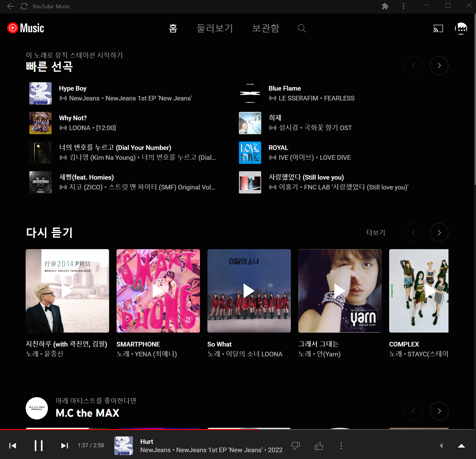 7. 유튜브 뮤직 앱은 위와 같이 생겼습니다. 조작법은 크게 어렵지 않아 사용하시는데 불편함은 없으실 겁니다. 이제 PC에서도 편하게 유튜브 뮤직을 감상하면서 작업을 할 수 있겠습니다.