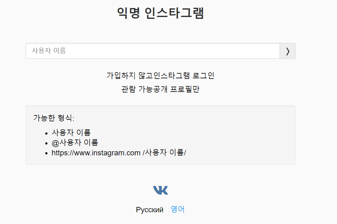 이 사이트도 사용방법은 확인하고자 하는 인스타그램 아이디를 검색창에 쓰시고 조회하시면 됩니다. 위 그림의 가능한 형식을 보시면 아시겠지만 사용자 이름, @사용자 이름, https://www.instagram.com/사용자 이름 모두 가능합니다. 심플한 기능만을 제공하고 있기 때문에 속도는 굉장히 빠른 편입니다.