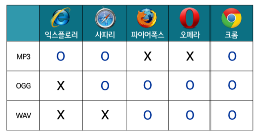 웹 브라우저에서 사용할 수 있는 오디오 파일 형식은 MP3, OGG, WAV와 같이 3가지가 있습니다. 익스플로러에서는 MP3 파일 형식만 지원하며, 사파리에서는 MP3와 OGG 파일 형식을 지원합니다. 파이어폭스와 오페라는 OGG와 WAV 파일 형식을 지원하며 크롬은 MP3, OGG, WAV 모든 파일 형식을 지원합니다. 웹 문서에서 비디오 파일을 사용할 때 해당 브라우저에서 지원하는 오디오 파일 형식을 확인해야 합니다.